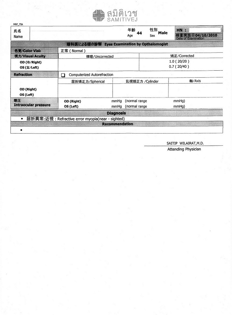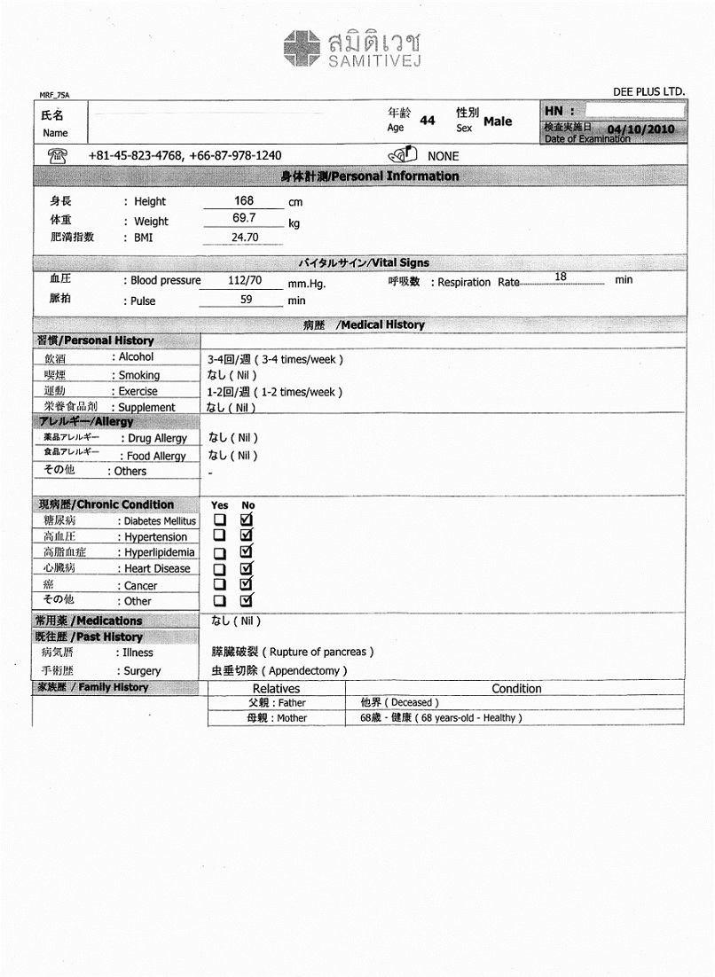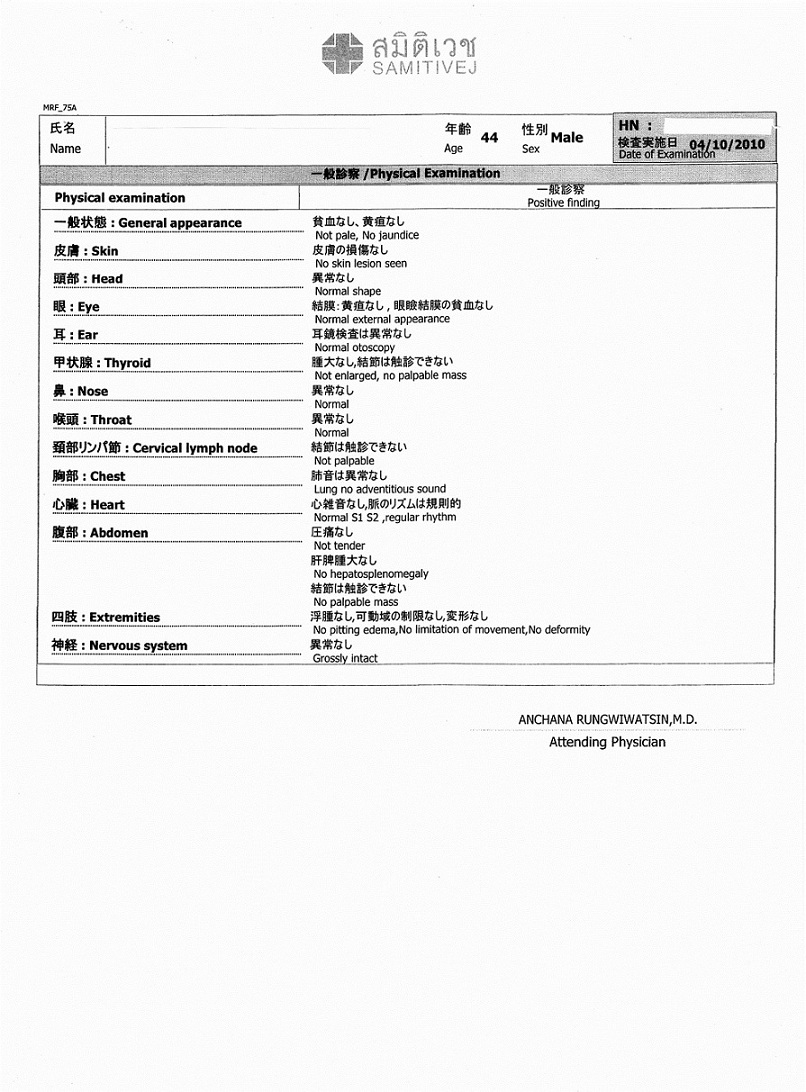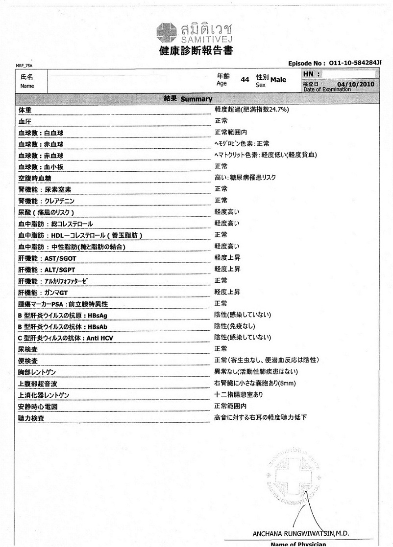 サミティベート(スクンビット)総合病院 の人間ドック検診結果報告書例