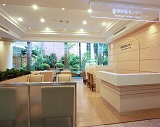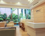 1階の日本人窓口にて受付。ご予約の確認・診察券の作成・保険手続きのご案内など。